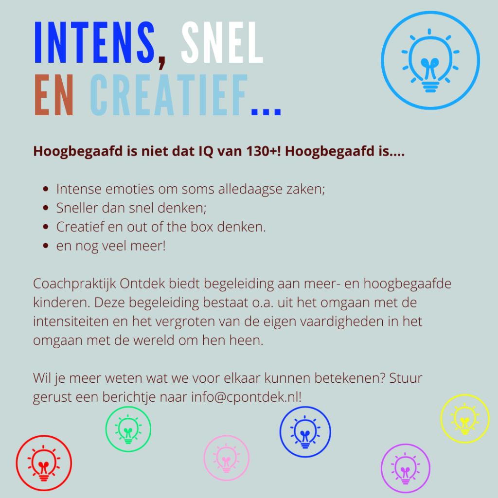 Bij Coachpraktijk Ontdek zijn alle vragen en hobbels die je tegenkomt rondom meer- en hoogbegaafdheid bij kinderen welkom. Vanuit passie, kennis en blijvend ontwikkelende kunde bieden we letterlijk en figuurlijk de rust en ruimte om zorgen en vragen neer te leggen. Voor meer informatie en vragen kun je contact opnemen per mail (info@cpontdek.nl) of bel naar 06-48404715.